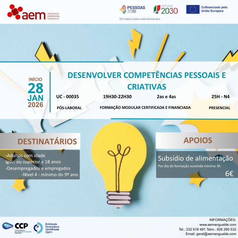 Na sequência da aprovação da Candidatura Integrada de Formação Modular Certificada – CIF, submetida ao Programa Temático Demografia, Qualificações e Inclusão (PESSOAS 2030), em parceria com a CCP - Confederação do Comércio e Serviços de Portugal, com o Código de Operação PESSOAS-FSE+-00999400.