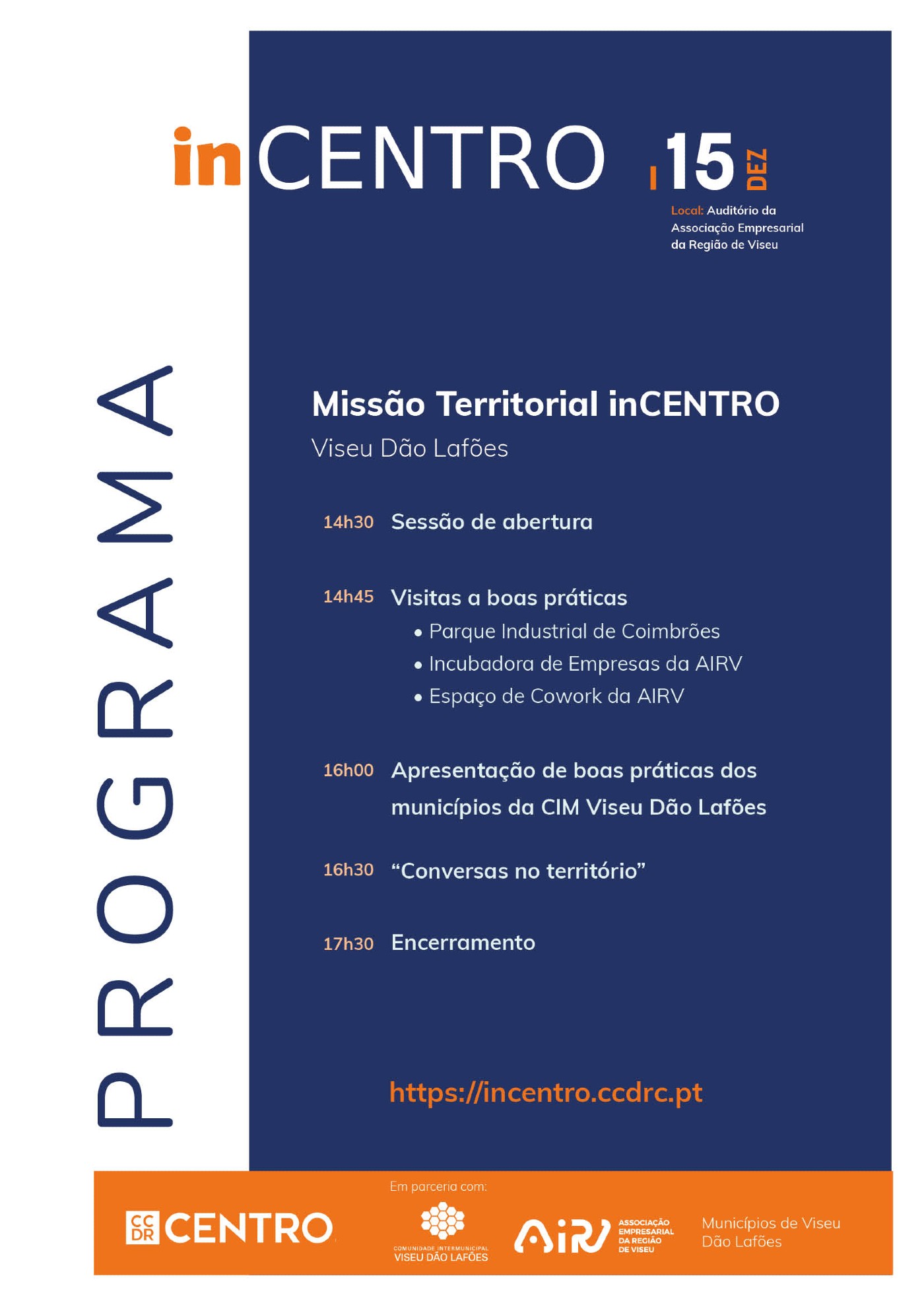 A CCDRC - Comissão de Coordenação e Desenvolvimento Regional do Centro, I.P., em parceria com a CIM VDL - Comunidade Intermunicipal Viseu Dão Lafões, a AIRV – Associação Empresarial da Região de Viseu e os Municípios de Viseu Dão Lafões, realiza a Missão Territorial inCENTRO – Viseu Dão Lafões, no próximo dia 15 de dezembro de 2025, na AIRV em Viseu, conforme programa infra.